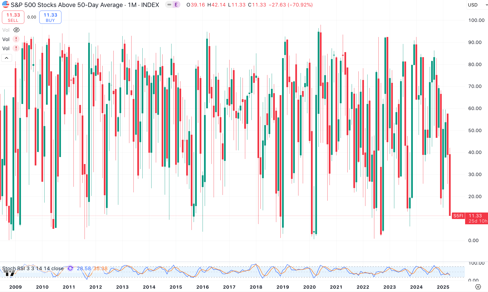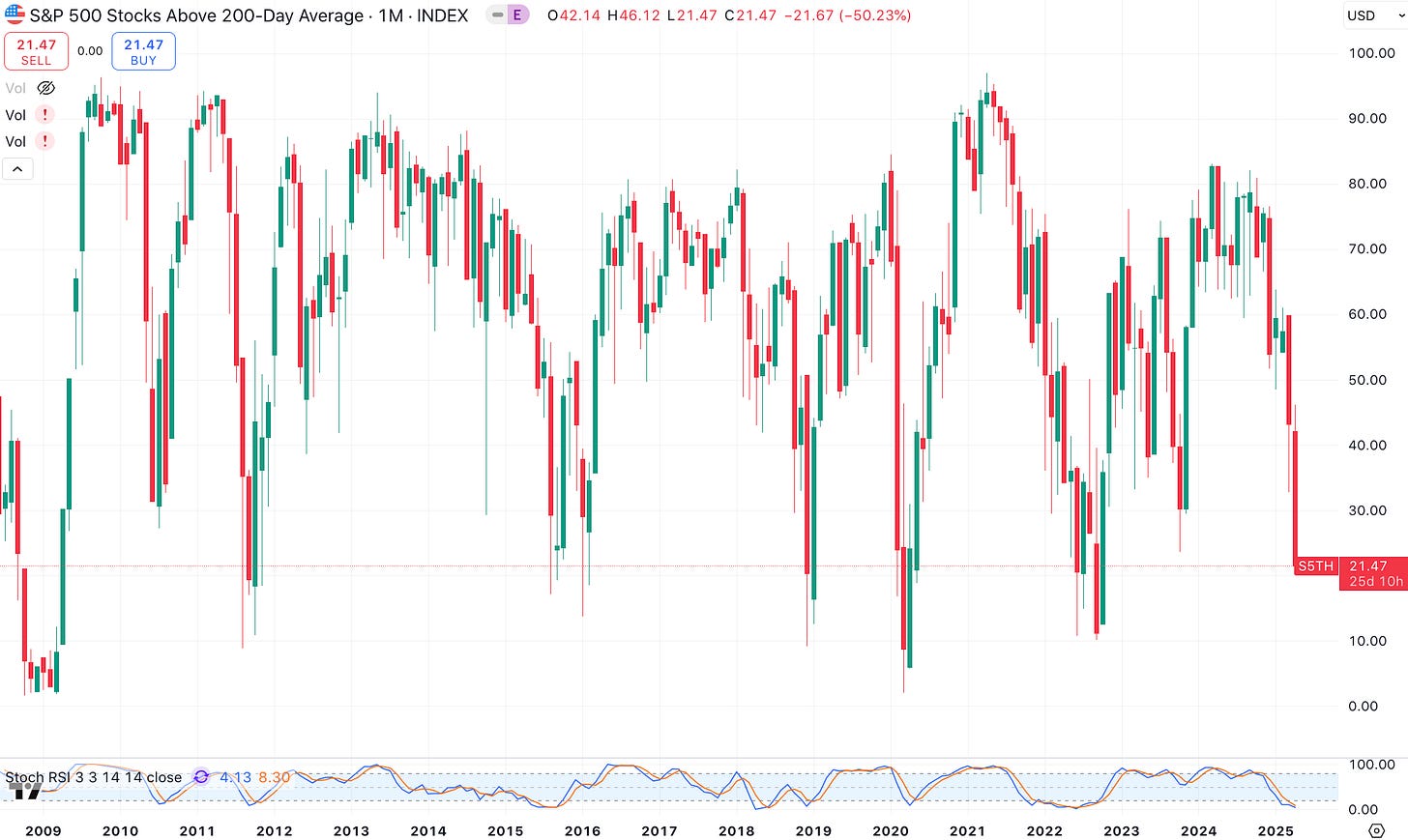 This second chart shows the percentage of stocks above the 200-day moving average dropping to 21, meaning 21% of S&P 500 stocks are trading above their 200-day moving average.